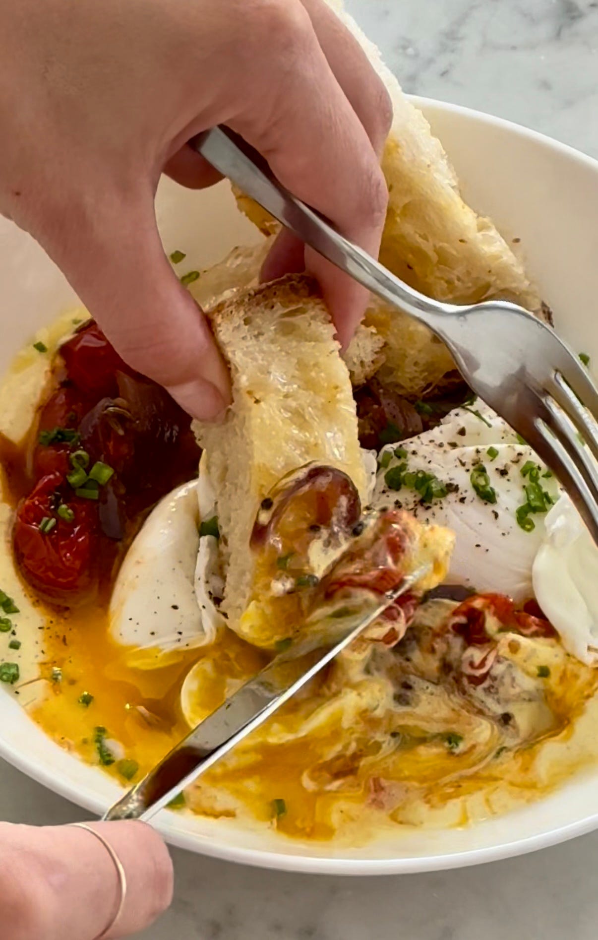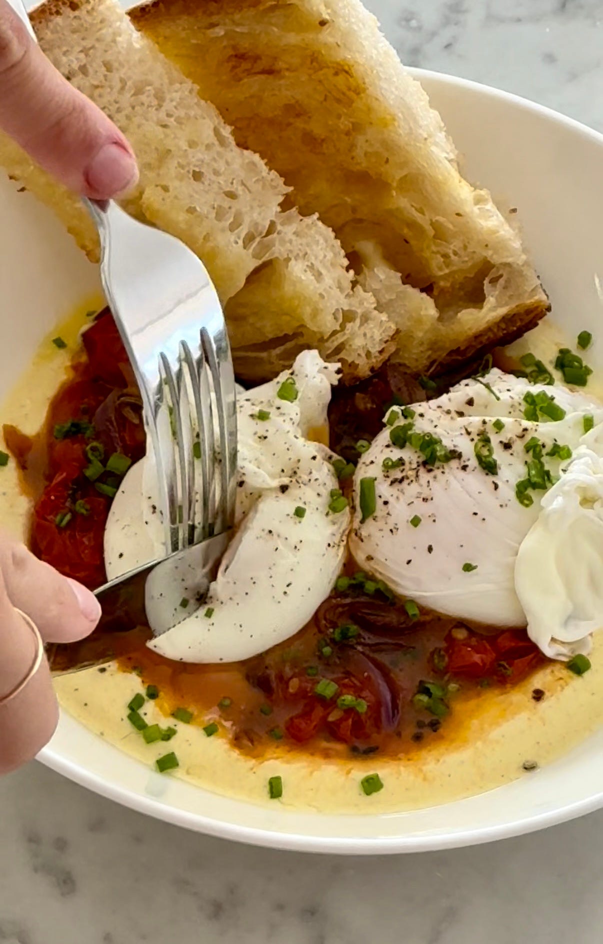 Plate up starting with the garlic yoghurt, curried tomatoes, poached eggs, chives and toasted bread.