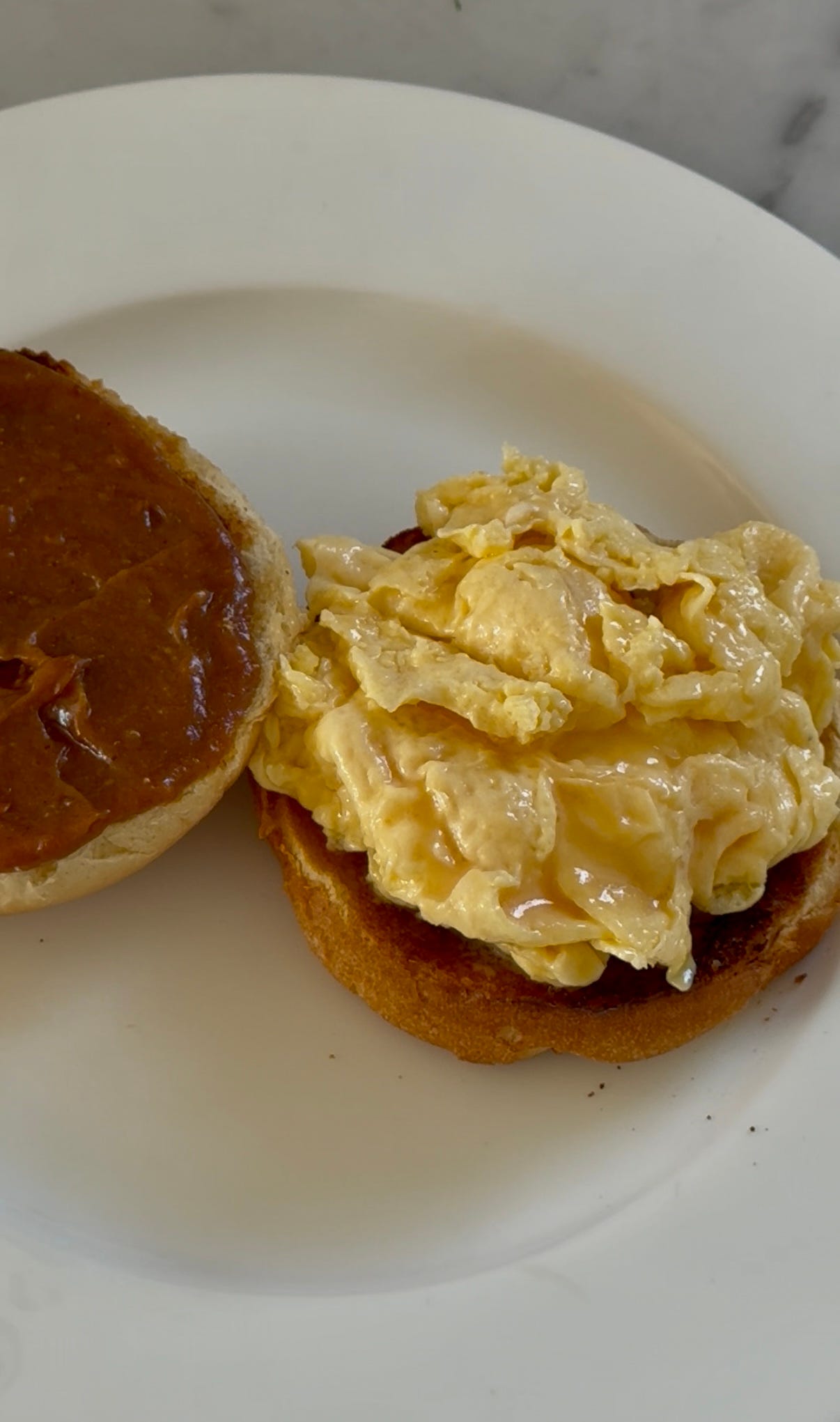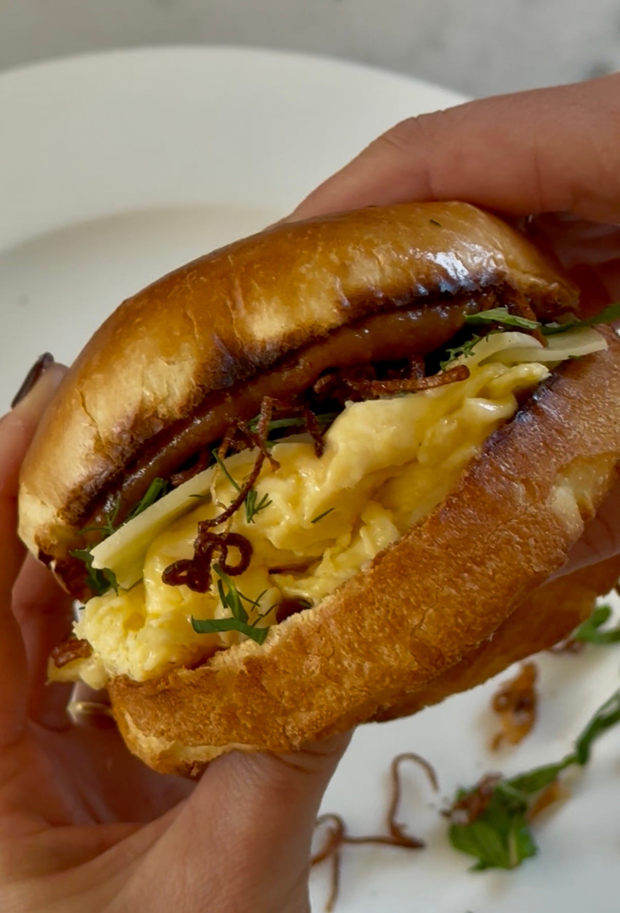Toast your brioche bun, buttering the base and spreading the tamarind ketchup on the top bun. Make your scrambled eggs and top with cheese, herbs, shallots. Close the bun and woweee, enjoy.