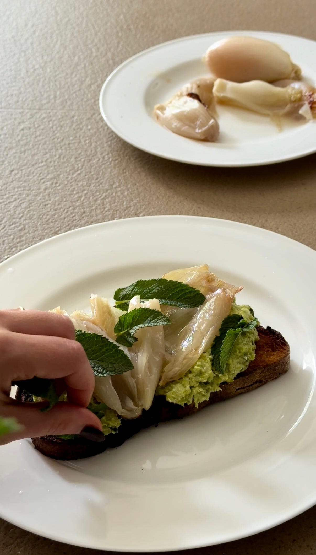 Toast bread, top with pea and feta puree, squeeze out shallots from their skins and season them with salt and lemon. Top with fresh mint.