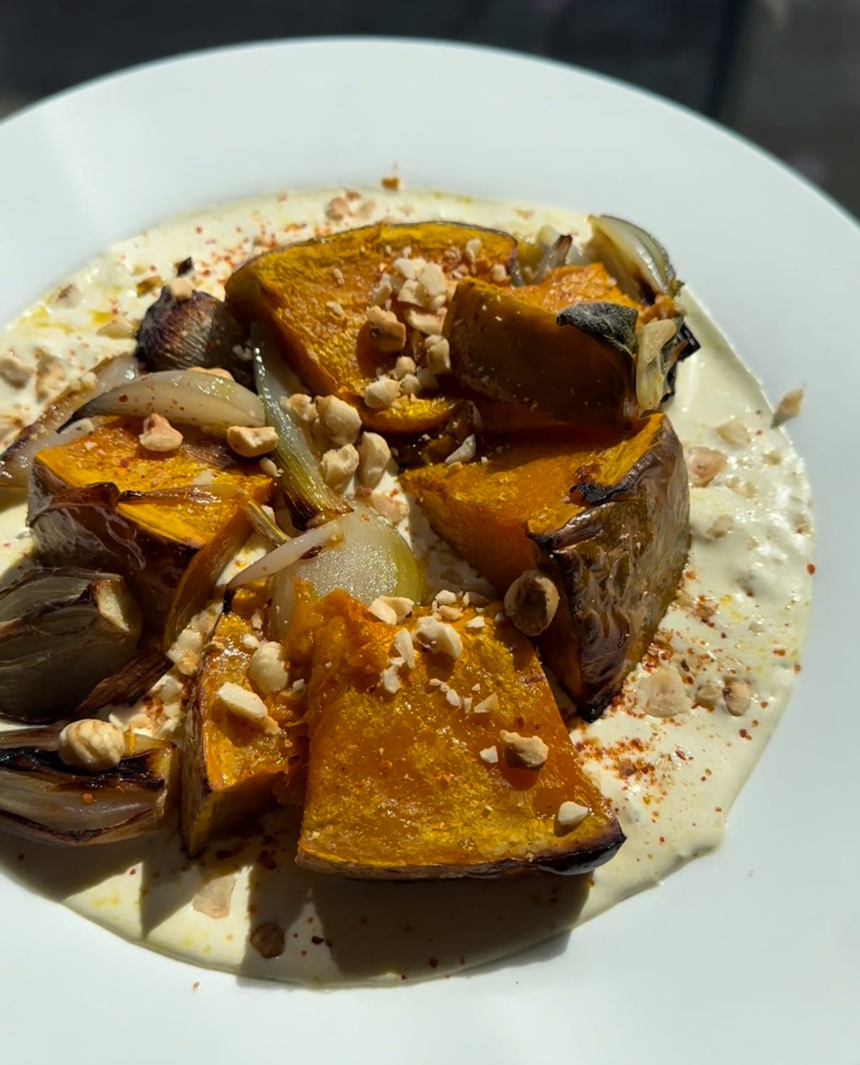 Once the pumpkin has finished cooking, plate your whipped burrata, top with pumpkin, shallots and sage and the finish with a sprinkling of hazelnuts and a little berber chilli.