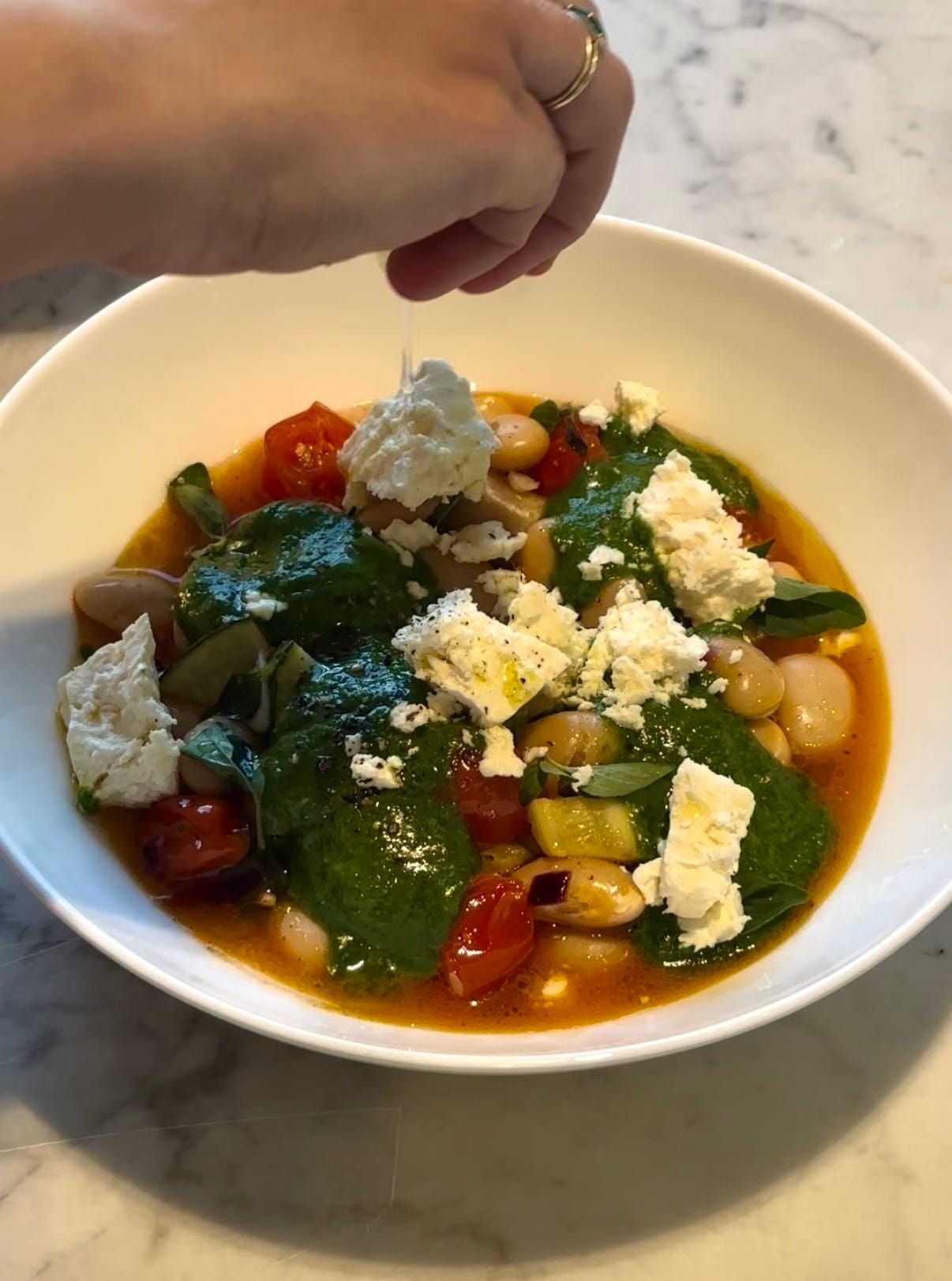 Serve in bowls and top with feta, oregano and a few dollops of the pesto.