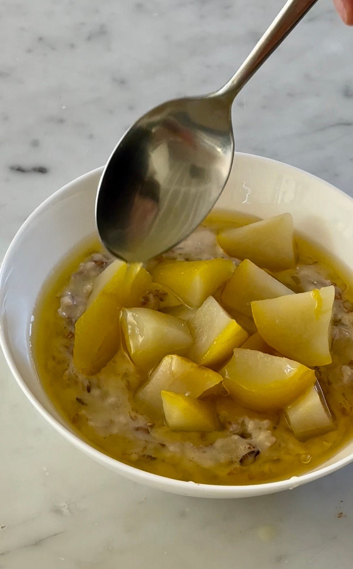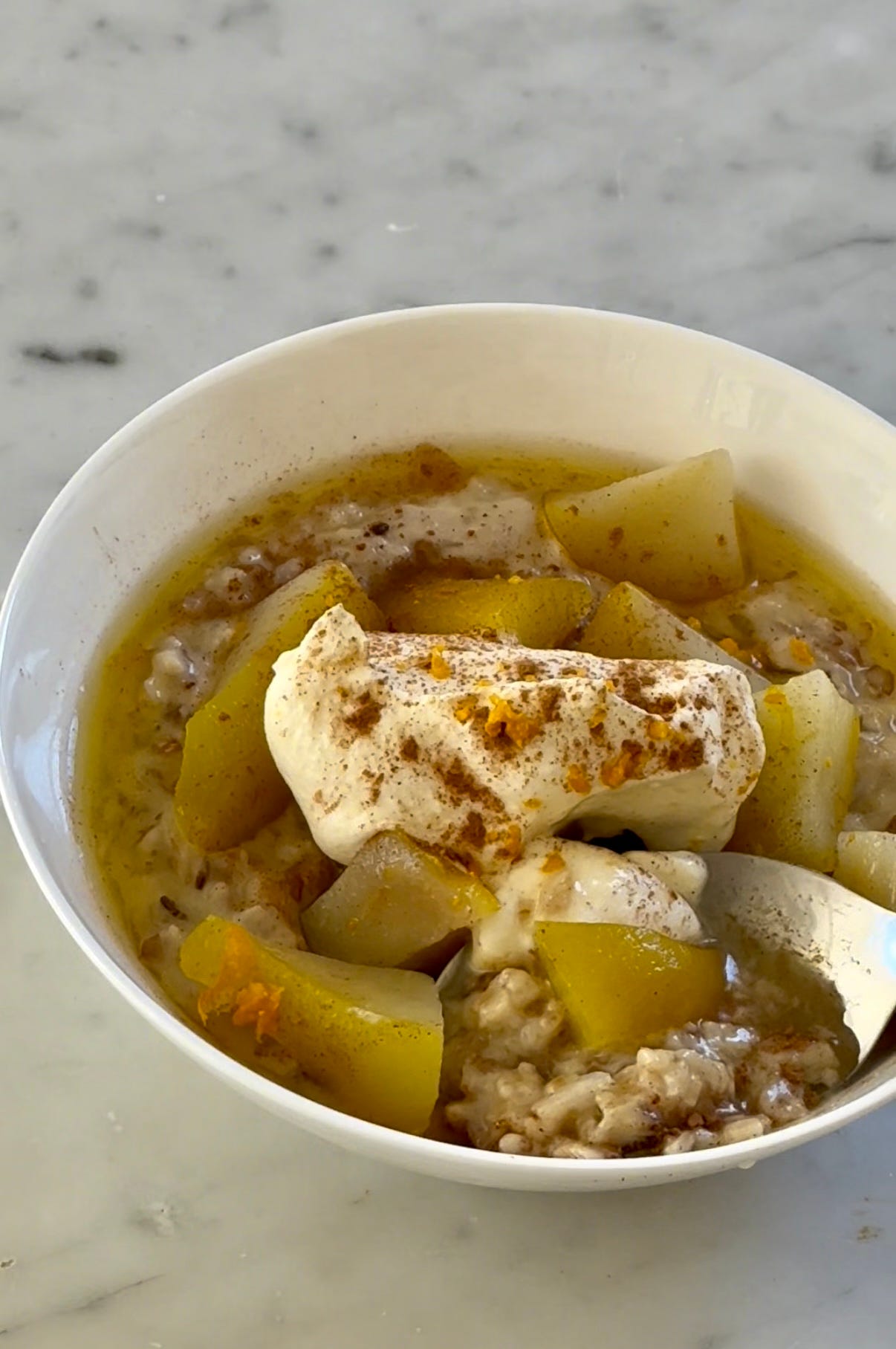 Top with diced pear, pear juices, orange cream and cinnamon.